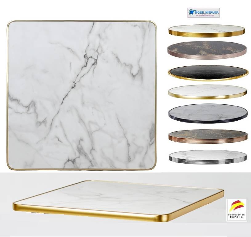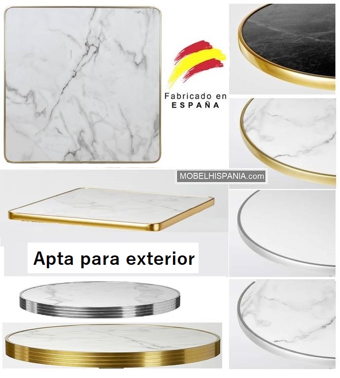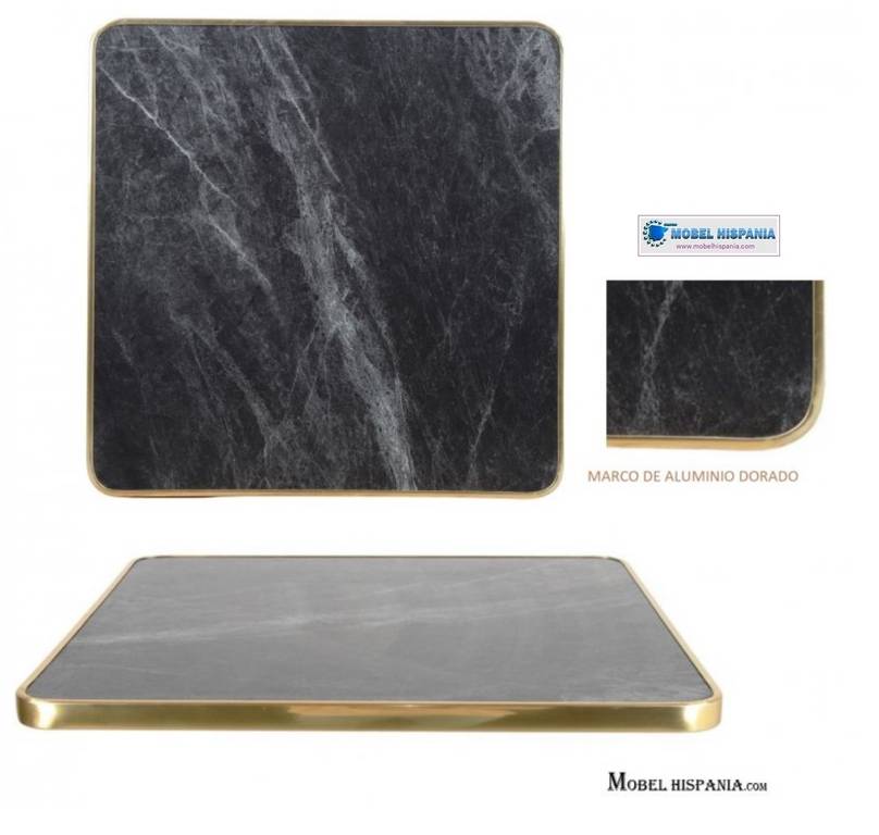 Mesa con tapa aro dorado imita marmol pie de forja aluminio o hierro fundido