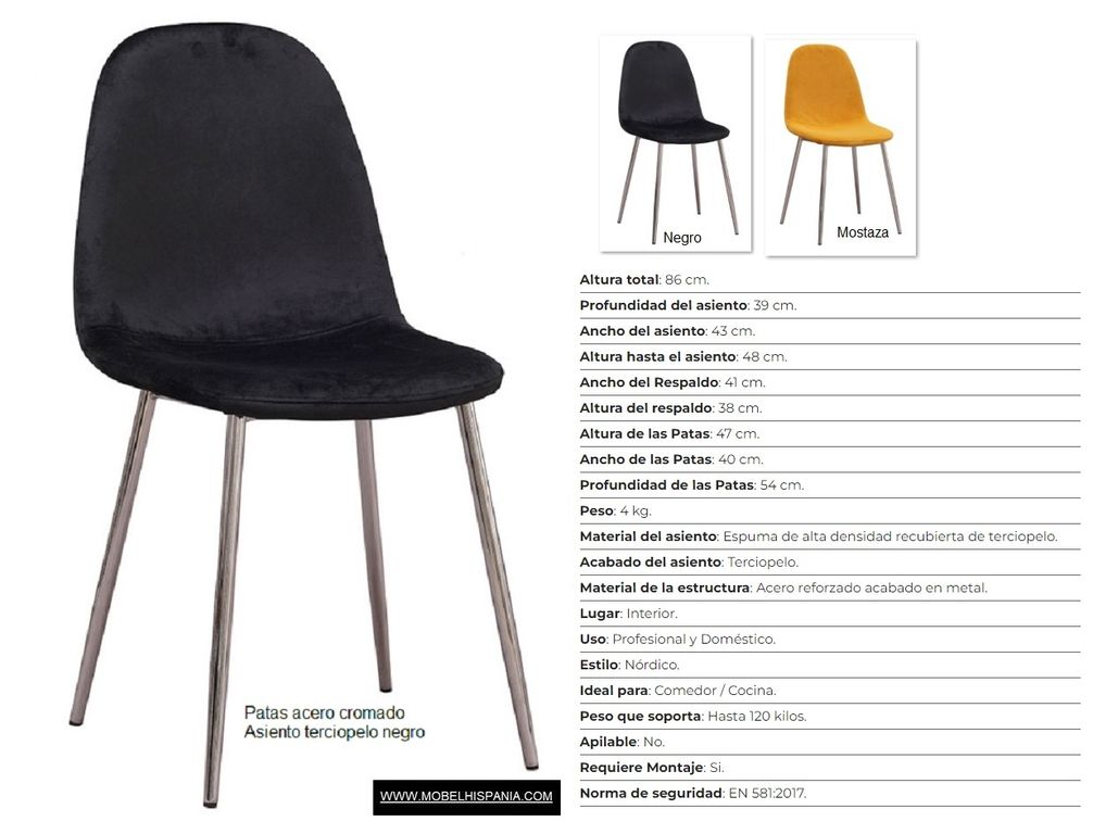 Asiento y respaldo tapizado en terciopelo en negro o mostaza.