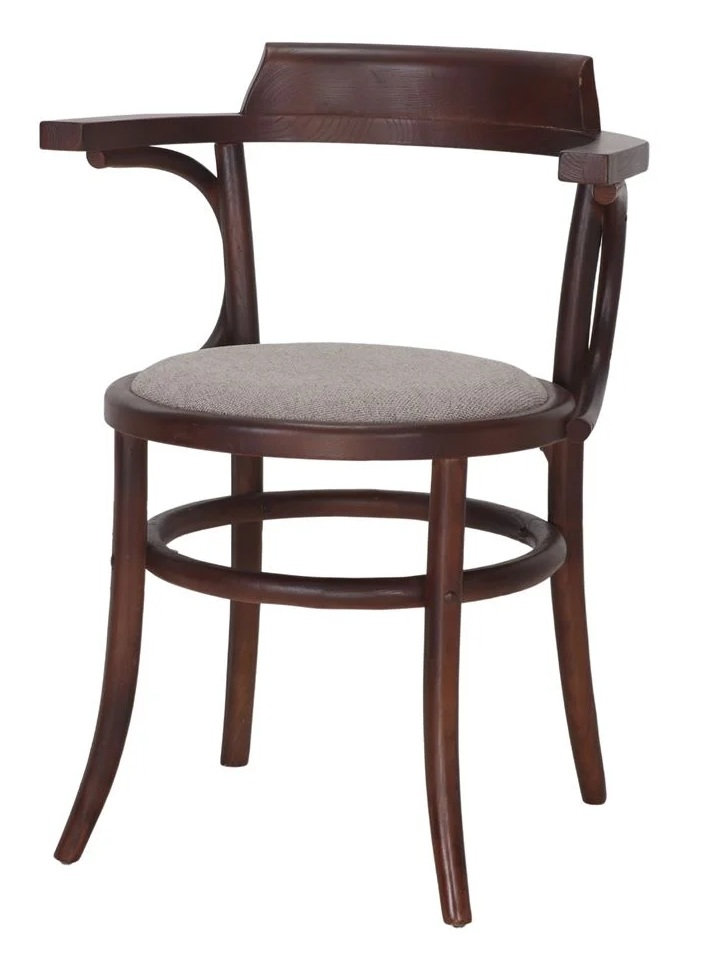 El asiento tapizado en textil color trufa añade un toque de sofisticación y comodidad, complementando a la perfección el acabado en nogal de la madera.