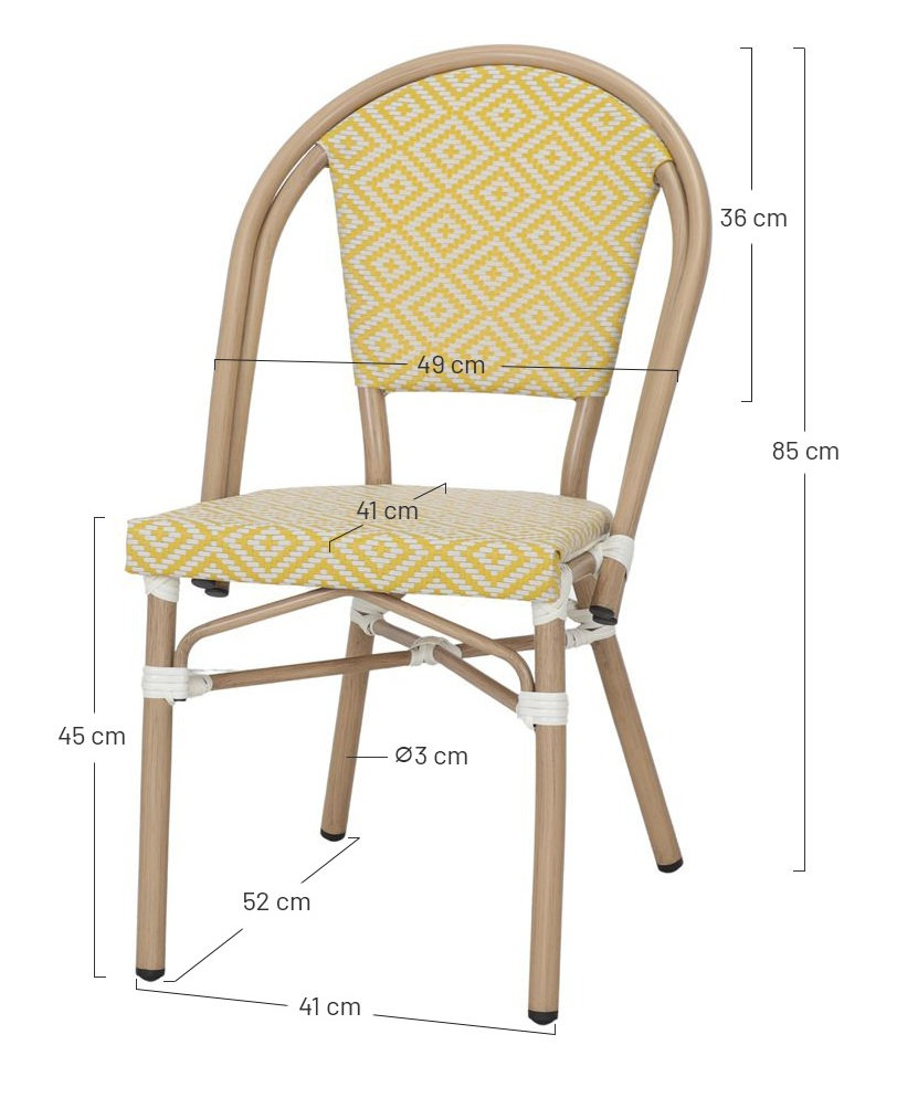 La silla de exterior Stilio es la opción perfecta para quienes buscan un equilibrio entre elegancia, comodidad y funcionalidad. Inspirada en el estilo Bistró, evoca el encanto de los cafés parisinos con un diseño clásico y atemporal que se adapta tanto a espacios exteriores como interiores. Su estructura tubular de aluminio con acabado en imitación bambú combina ligereza y resistencia, proporcionando una apariencia natural sin renunciar a la durabilidad. Este material es anticorrosivo y de fácil mantenimiento, ideal para su uso en terrazas, jardines o espacios de hostelería. El asiento y el respaldo están fabricados en médula de ratán sintético trenzado, un material diseñado para soportar las inclemencias del tiempo sin perder su flexibilidad y confort. Su textura trenzada aporta un toque artesanal y acogedor, a la vez que garantiza una estructura firme y ergonómica. Además, la silla Stilio es apilable, lo que facilita su almacenamiento y optimiza el espacio cuando no está en uso. Su versatilidad la convierte en una excelente elección para cafeterías, restaurantes, terrazas o incluso comedores con un aire rústico y sofisticado.