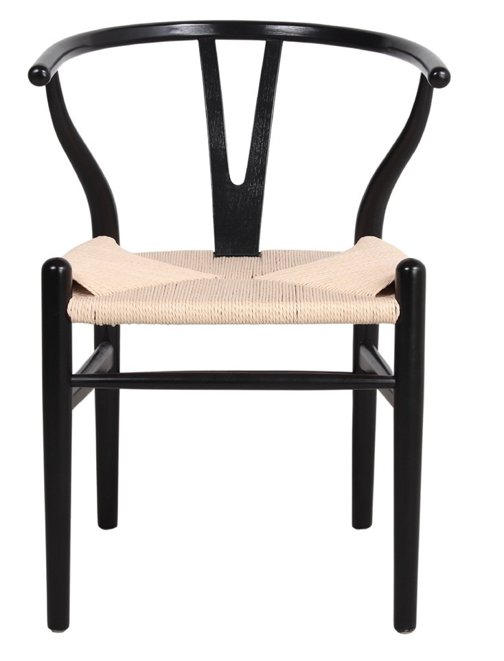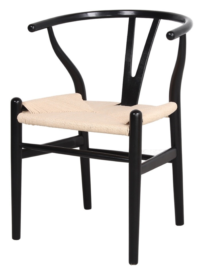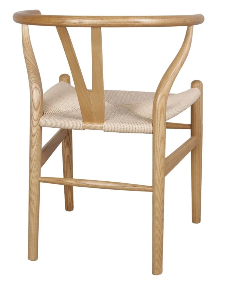 Silla de madera Wegner, de estilo Nórdico, con estructura de madera y asiento de fibra natural trenzada.