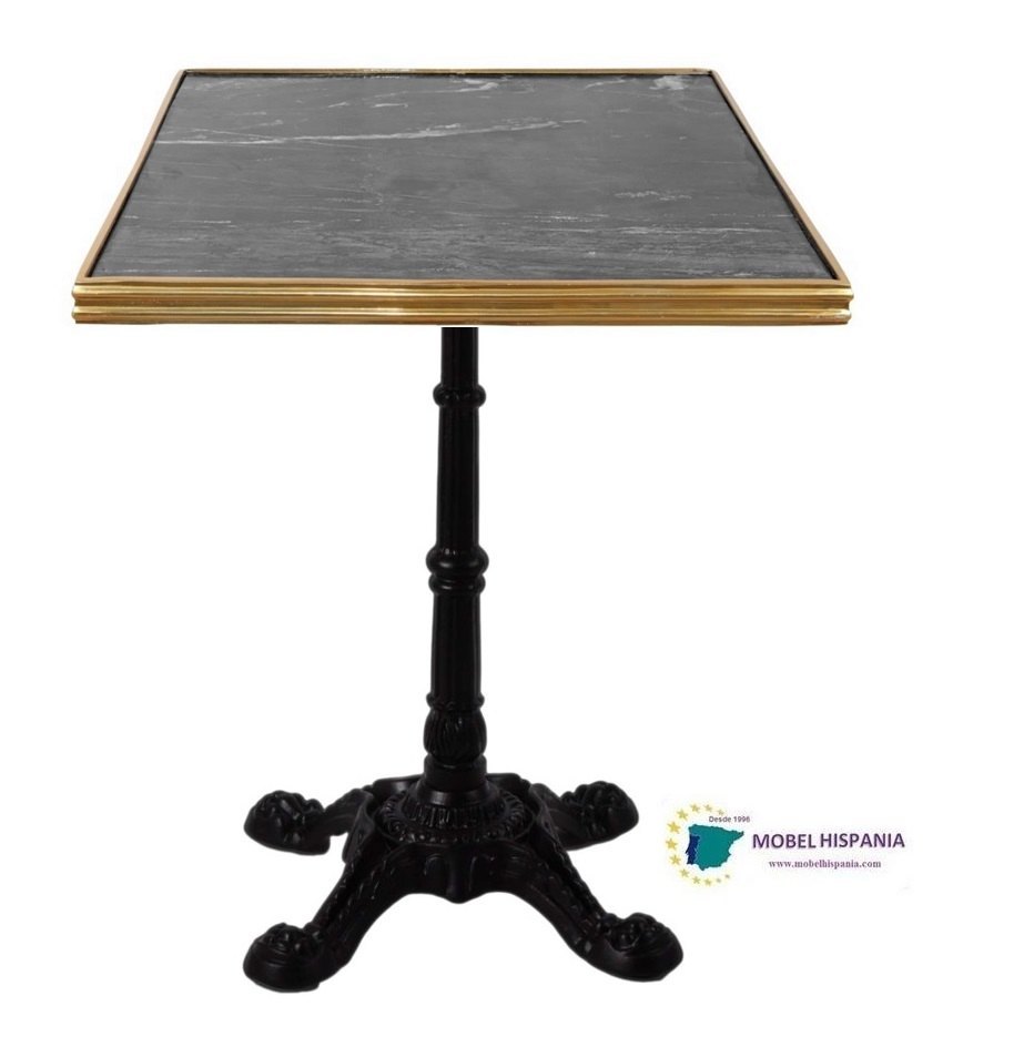 Tapa de mármol verde encastrada en marco de metal con acabado en oro.