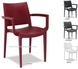 Silla con brazos para uso interior y exterior Inyectada en polipropileno con fibra de vidrio. Apilable. Protección contra rayos UV. Peso neto 5,02 kg. Colores: Blanco, Chocolate,Negro,Arena,Verde Oliva,gris oscuro Iva no incluido Palet de 20 ...