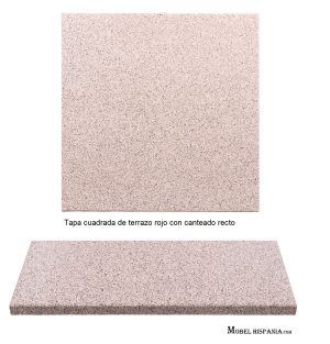 Tapa cuadrada de terrazo rojo con canteado recto mediante fresado.