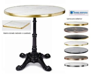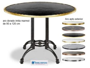 Mesa con tapa aro dorado imita marmol pie de forja aluminio o hierro fundido